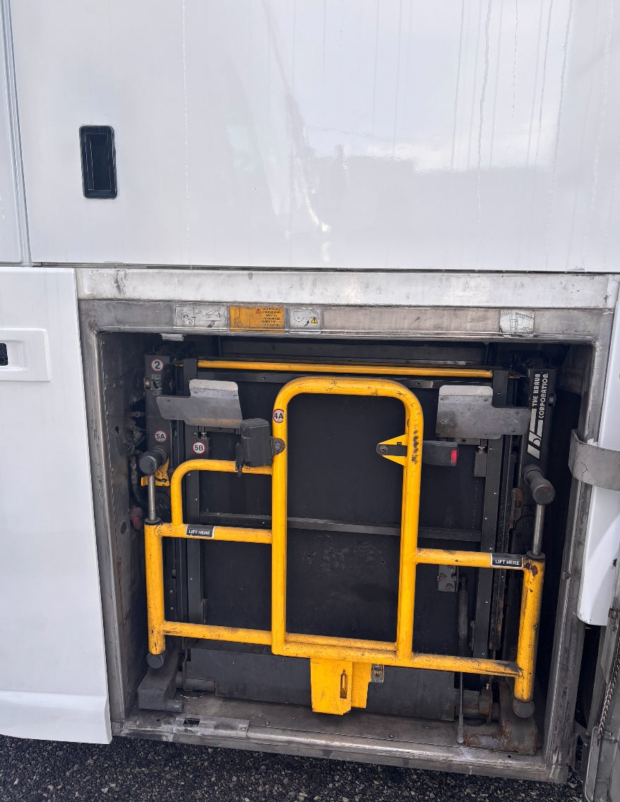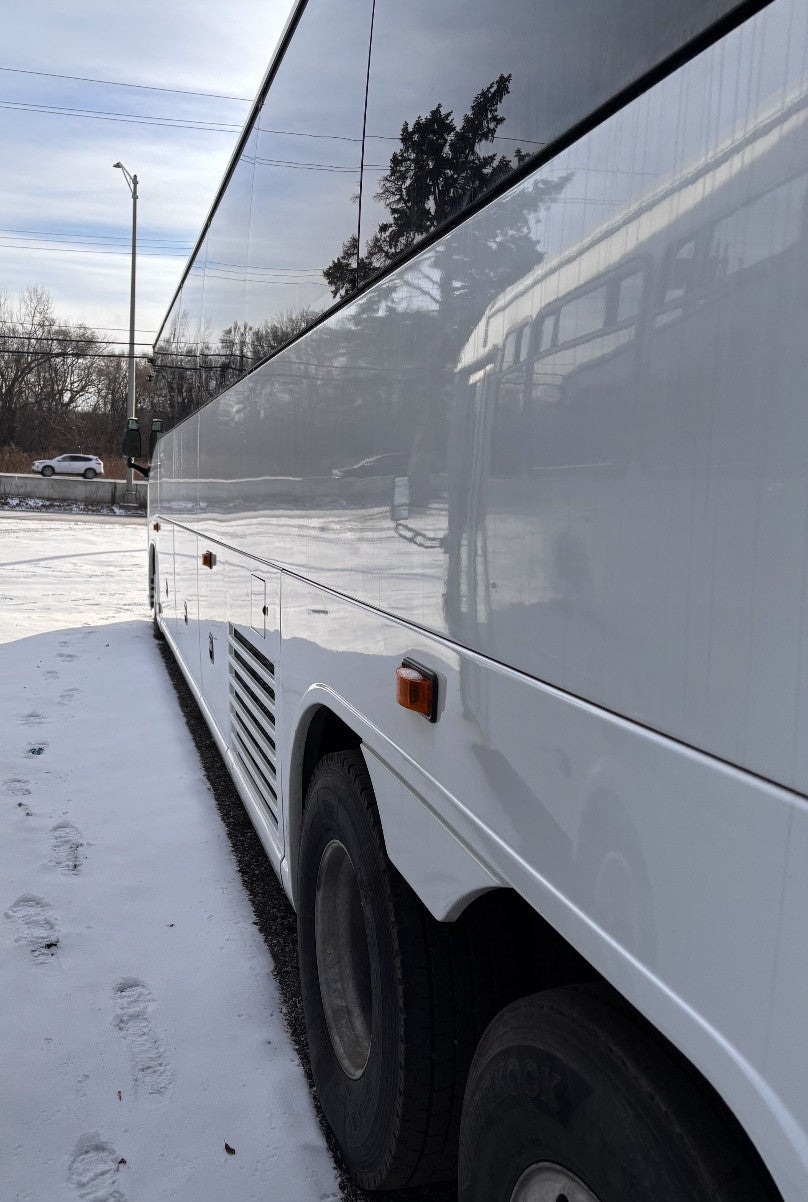 Detroit engine series 60, ZF Automatic transmission, 56 passenger conversational reclining seats, Restroom, oversized video/tv monitors, DVD, 110V outlets at every row, ADA Lift, video surveillance throughout the coach. Oil change and belts have been completed.
